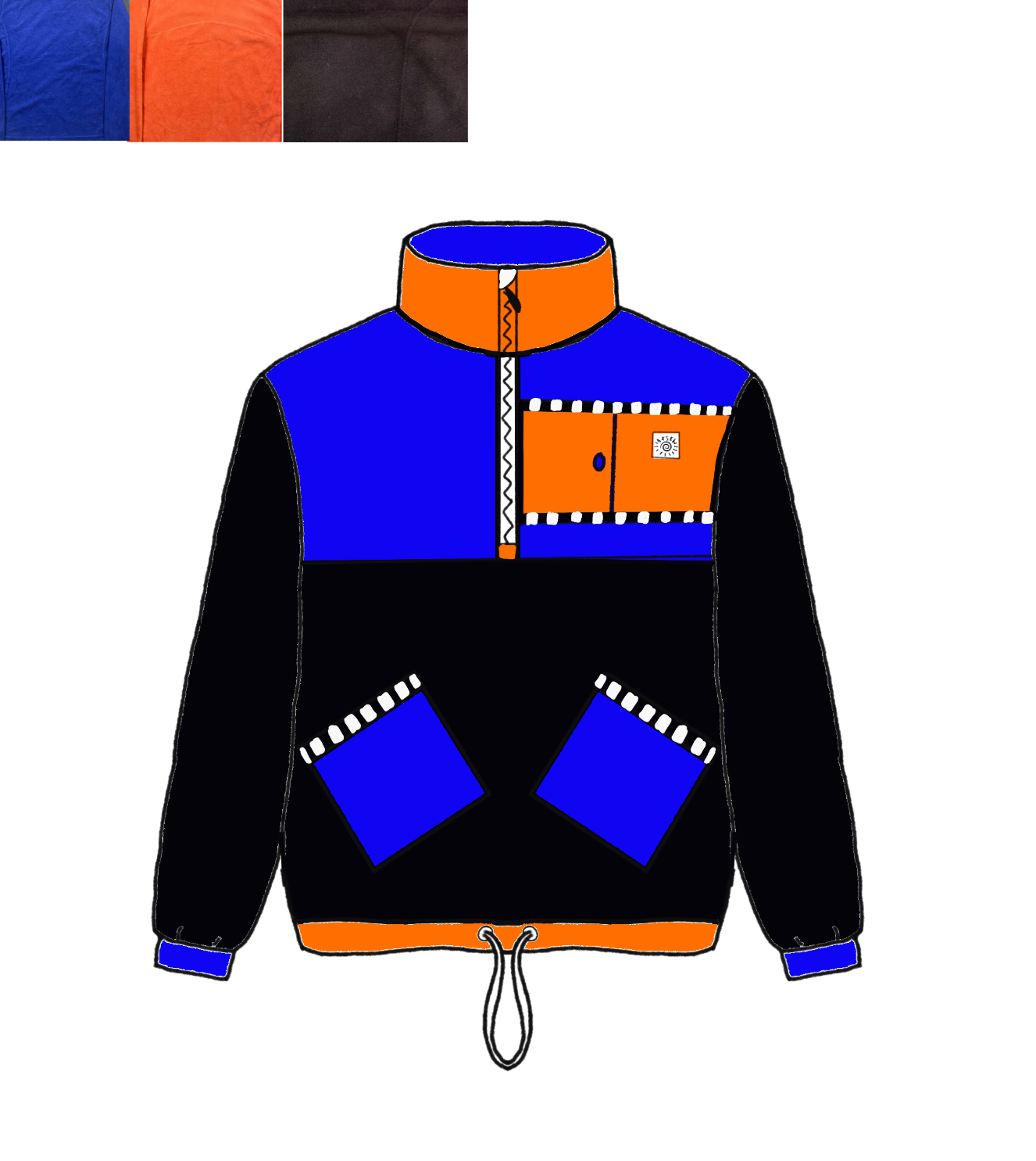 Polaire unisexe upcyclée aux couleurs vives – bleu électrique, orange vif et noir. Réalisée à partir de matières revalorisées. Confection 100 % artisanale en Bretagne.