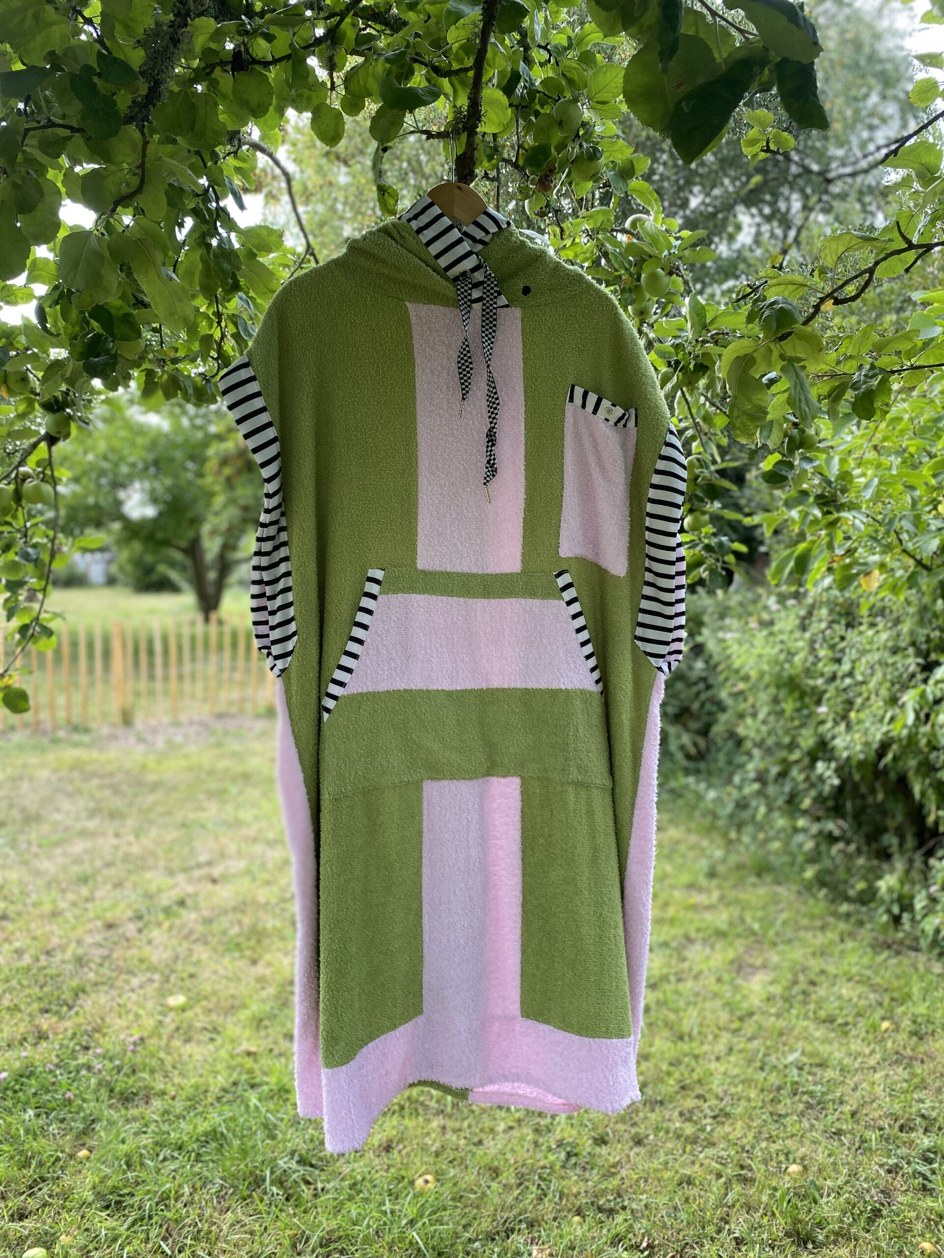 J’ai imaginé ce poncho de surf à partir de textiles upcyclés, pour que vous puissiez vous changer facilement sur la plage après une session de surf, tout en gardant du style ! Confortable et pratique, il te permettra de rester protégé du vent et des regards, tout en profitant de chaque instant sur le sable ou dans l’eau. Chaque poncho est unique !